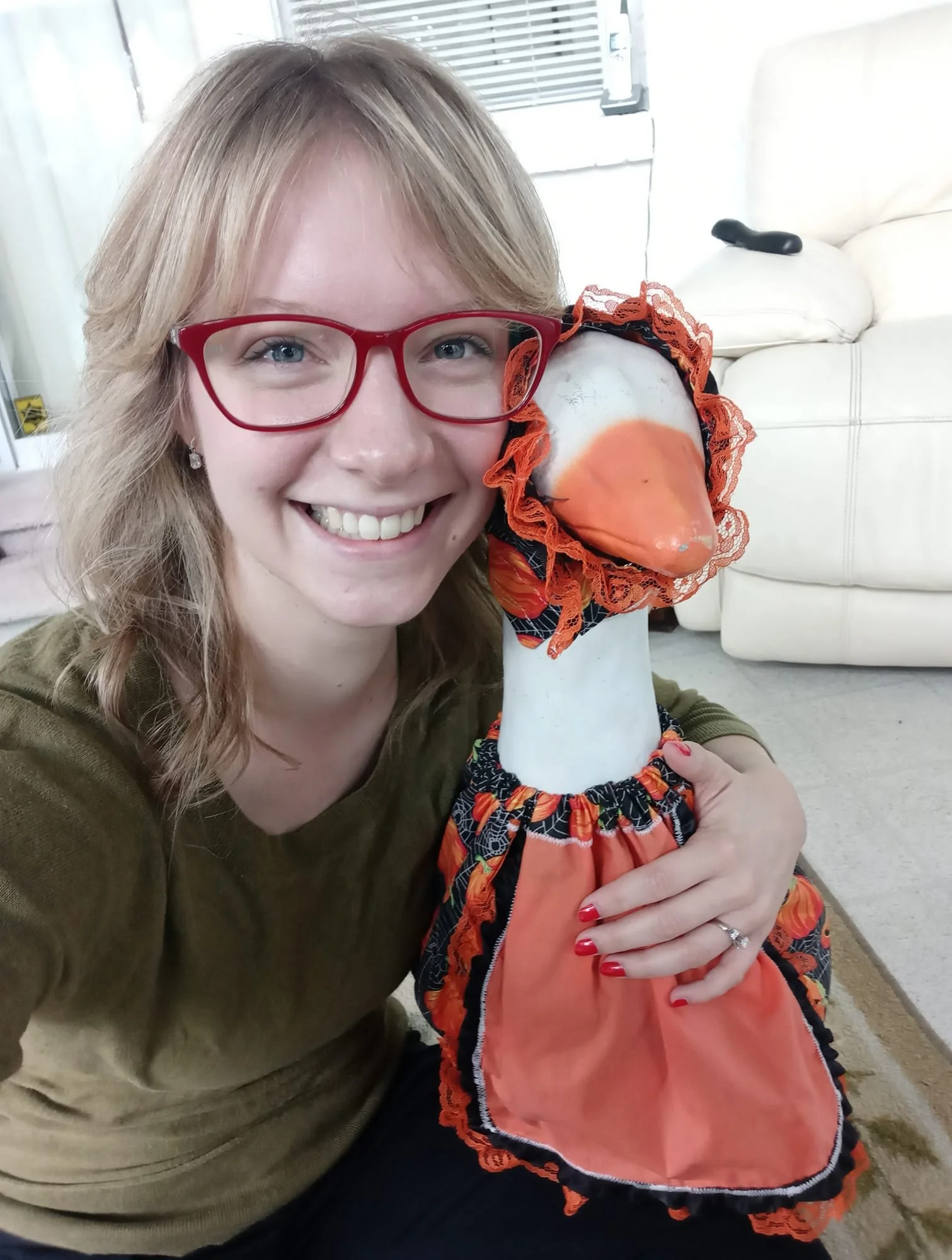In 2022, Erika (AKA Mother Goose) began the search for her very own porch goose, remembering the one our grandmother had in her garden when we were growing up. After many years cramped in a 1 bedroom apartment during her college years, she knew she eventually wanted to purchase a home with a porch to be able to proudly display a goose. So, the hunt began and eventually, a goose magically materialized. “Susan” became a car goose, waiting patiently for the day it could grace the porch of her and her husband’s first home.