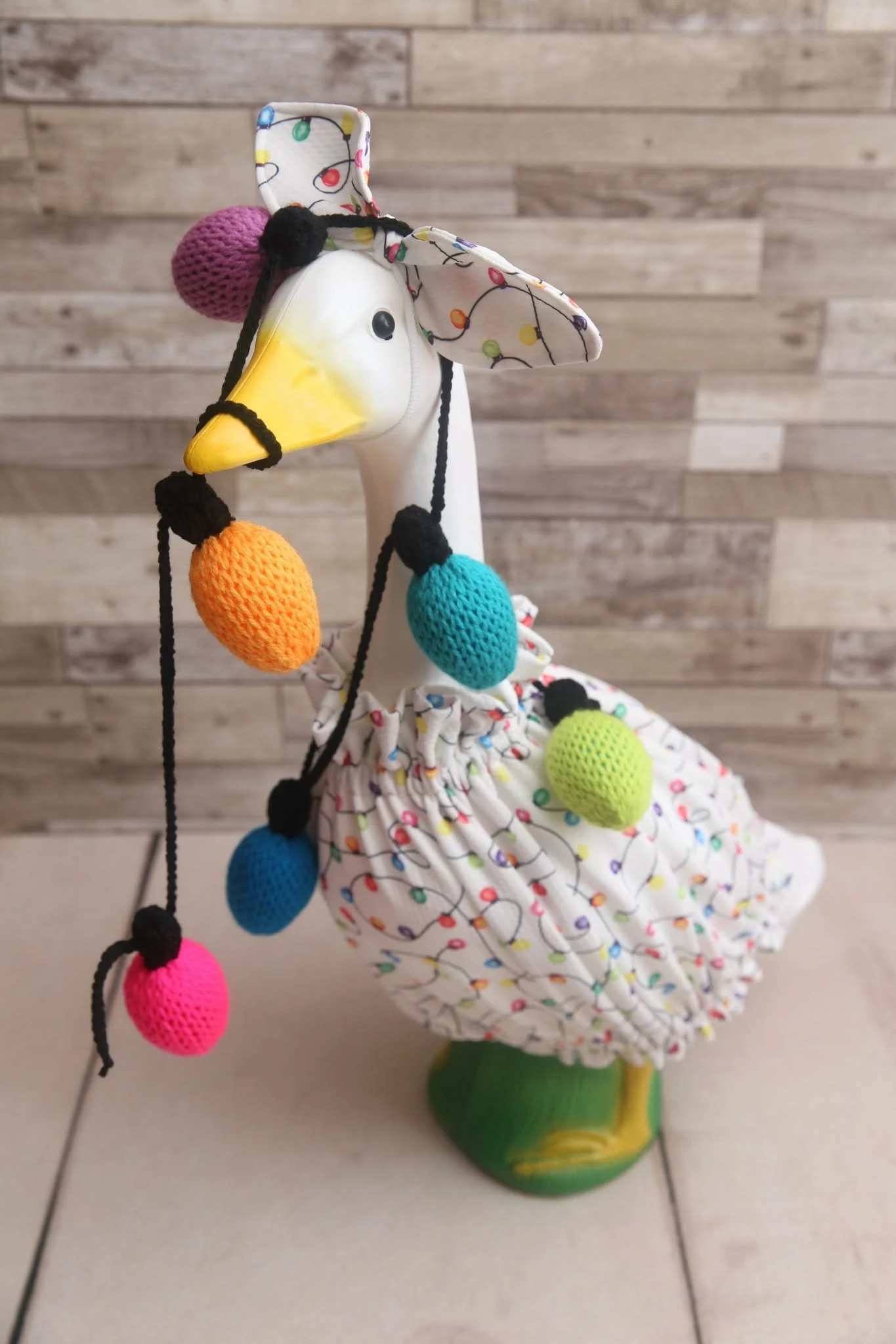 On the rare occasion I am not sewing, I enjoy just being around my husband and kids. We are a homeschooling family so we like to play games together, take random field trips to local places, and just love to laugh and spend our days as a family! Some of the most favorite items I have made (so far!) are my newsboy hats for larger geese and my scalloped hem desk goose outfits. I feel that those two things really set me apart. I also love my floral outfits. I prefer to use only stretch knit fabrics and that, too, seems to set me apart. At Christmas time, my favorite outfit was definitely the Christmas light outfit with Christmas lights garland!